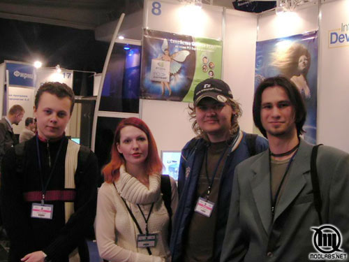 Делегация ModLabs.net в полном составе (справа налево: Laikrodiz, ALT-F13, Мусяка) и Алекс Бурдыко (3DNews) на фоне стенда NVIDIA.