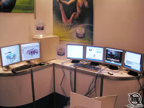 Экспозицию калифорнийской компании, без преувеличения, можно было назвать самым правильным стендом на выставке. Египетских пирамид на месте стенда никто не выстроил:), (боксы стендов у всех участников были совершенно идентичные), однако в имеющихся условиях NVIDIA максимально привели стенд к корпоративному стилю, одновременно показав "живьем" свои последние достижения.