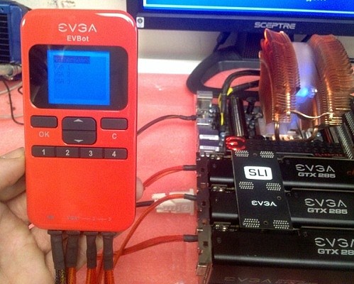 Девайс получил официальное название и уже находится на финальной, предрелизной стадии. EVBot (так его именуют) представляет собой компактный программно-аппаратный комплекс по управлению высокоуровневыми материнскими платами и видеокартами, такими как X58 SLI, P55FTW и GTX 285 Classified. Далее их список будет только расширяться. С его помощью можно контролировать тактовые частоты, ключевые напряжения, изменять скорость вращения вентилятора и сохранять заданные настройки в профиль. Максимальную актуальность EVBot представляет для энтузиастов, что в значительной степени может облегчить процесс разгона, сделав его более комфортным.