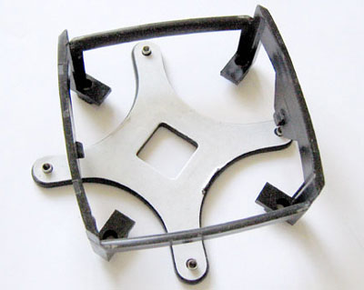 По прибытии новых кулеров для процессоров AMD (socket 754/939) и Intel (LGA 775) я обратил внимание на абсолютно одинаковый способ крепления к разъему, о котором – по ходу знакомства с участником тестирования. Отличие состояло лишь в том, что для процессоров с креплением типа LGA 775 в комплекте прилагается вот такая рамка, которая крепится к плате, а уже к ней крепится сам кулер: