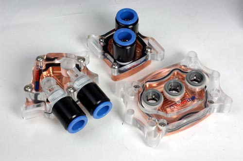 Набор Asetek WaterChill Antarctica KT12A-L30 поставляется с тремя теплообменниками, для охлаждения процессора, ядра видеокарты и северного моста. Все изготовляются по одинаковой технологии: медная подошва с фрезерованным каналом прохода жидкости и толстая акриловая крышка, к которой крепятся 1/2-дюймовые штуцера системы Push-on.
