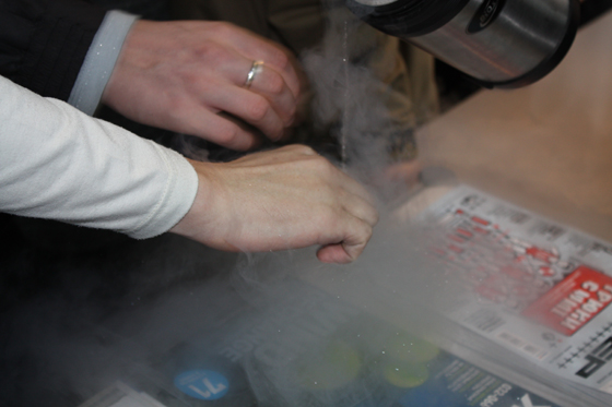 Азот кипит, народ полон энтузиазма, все опять при деле. И даже те, кто не отвечал на вопросы и кто не участвовал в основном конкурсе, тоже получили заряд бодрости и адреналина. Дело в том, что мы никак не могли упустить момент и не полить азота на шаловливые ручонки зевак :)