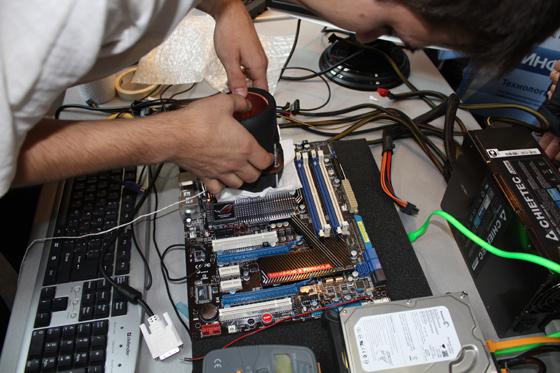 Как только стенд был готов, сразу же набралась целая толпа добровольцев для участия в азотном соревновании. Всем и каждому просто нетерпелось покрутить настройки BIOS в попытке выиграть главный приз.