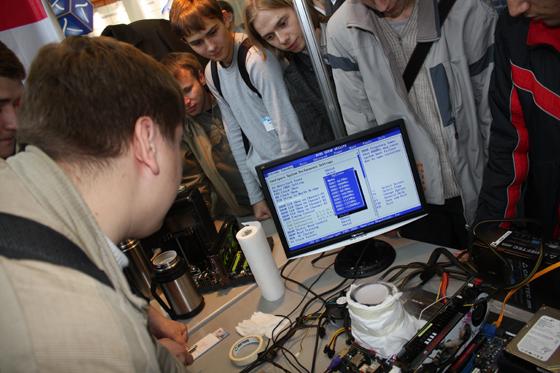Прибыли на место событий. Шли меж стендов различных IT компаний, то и дело натыкаясь на раздающих листовки представителей и представительниц той или иной фирмы. Добрались до своего стенда и приступили к монтажу демонстрационной системы. В качестве "азотного эксперта" выступал Василий aka Mrak.