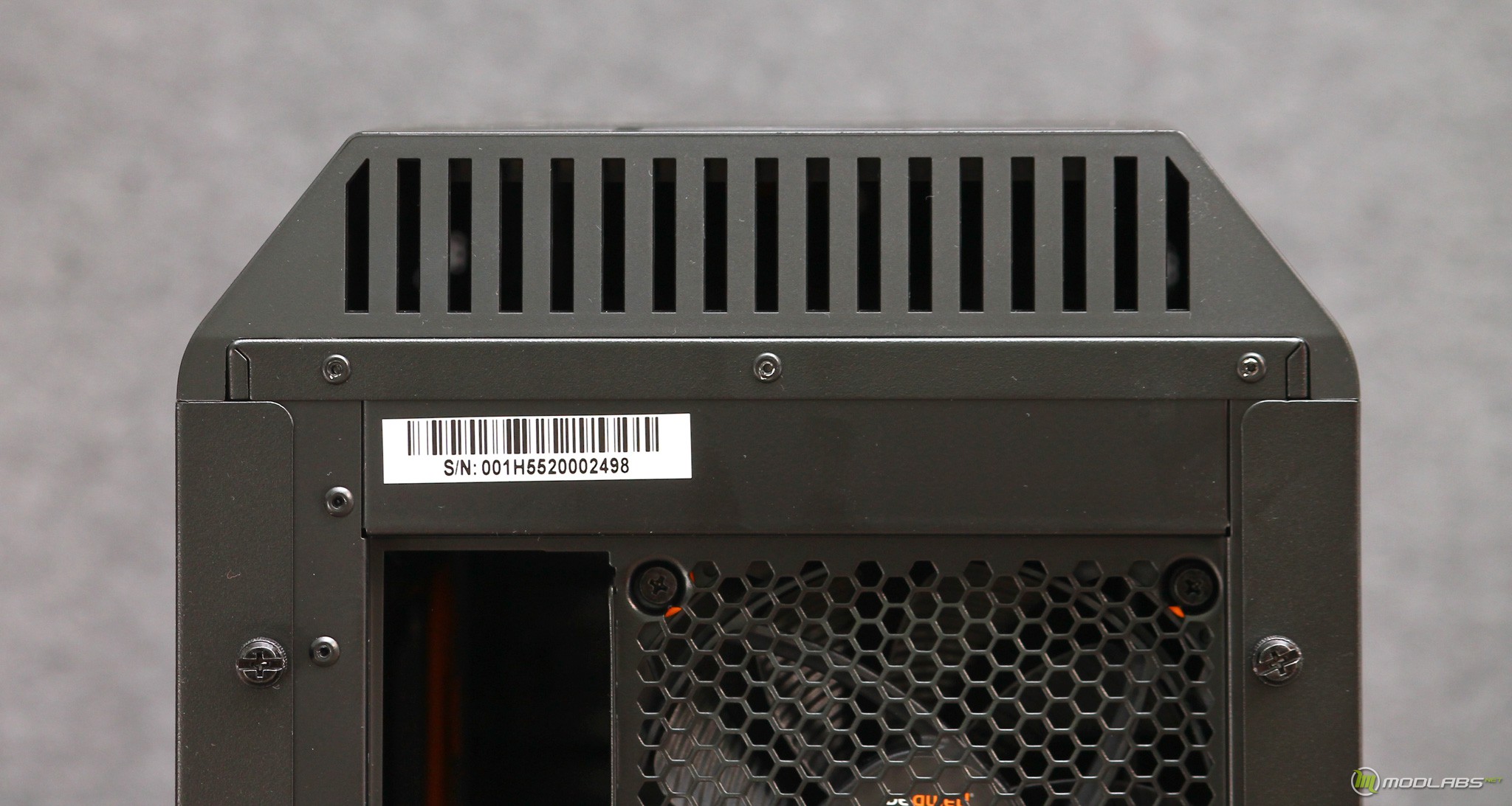 Обратная сторона корпуса в целом ничем не выделяется. На ней есть посадочное место для одного 120-мм вентилятора, семь заглушек слотов расширения материнской платы и три прорези для шлангов системы водяного охлаждения. Блок питания находится в нижней части. Интересно, но рядом с заглушками слотов расширения есть большая перфорация, что не совсем сочетается с подходом к шумоизоляции.