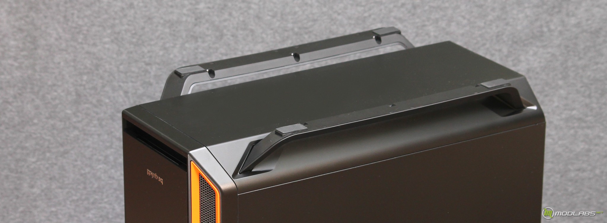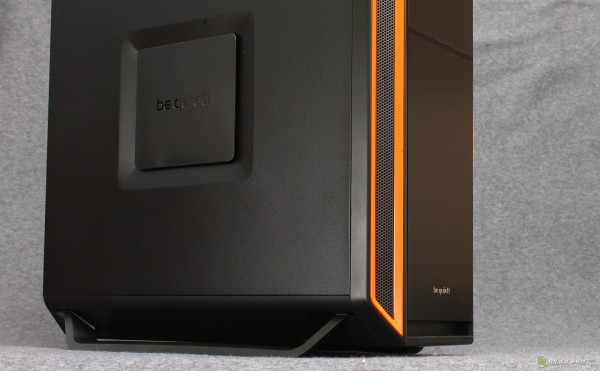 Яркие оранжевые вставки еще раз помогают подчеркнуть срезы под 45 градусов в лицевой панели корпуса Silent Base 800. Остальное пространство занято прямыми “крышками”, лишь небольшой логотип be quiet! разбавляет ситуацию.