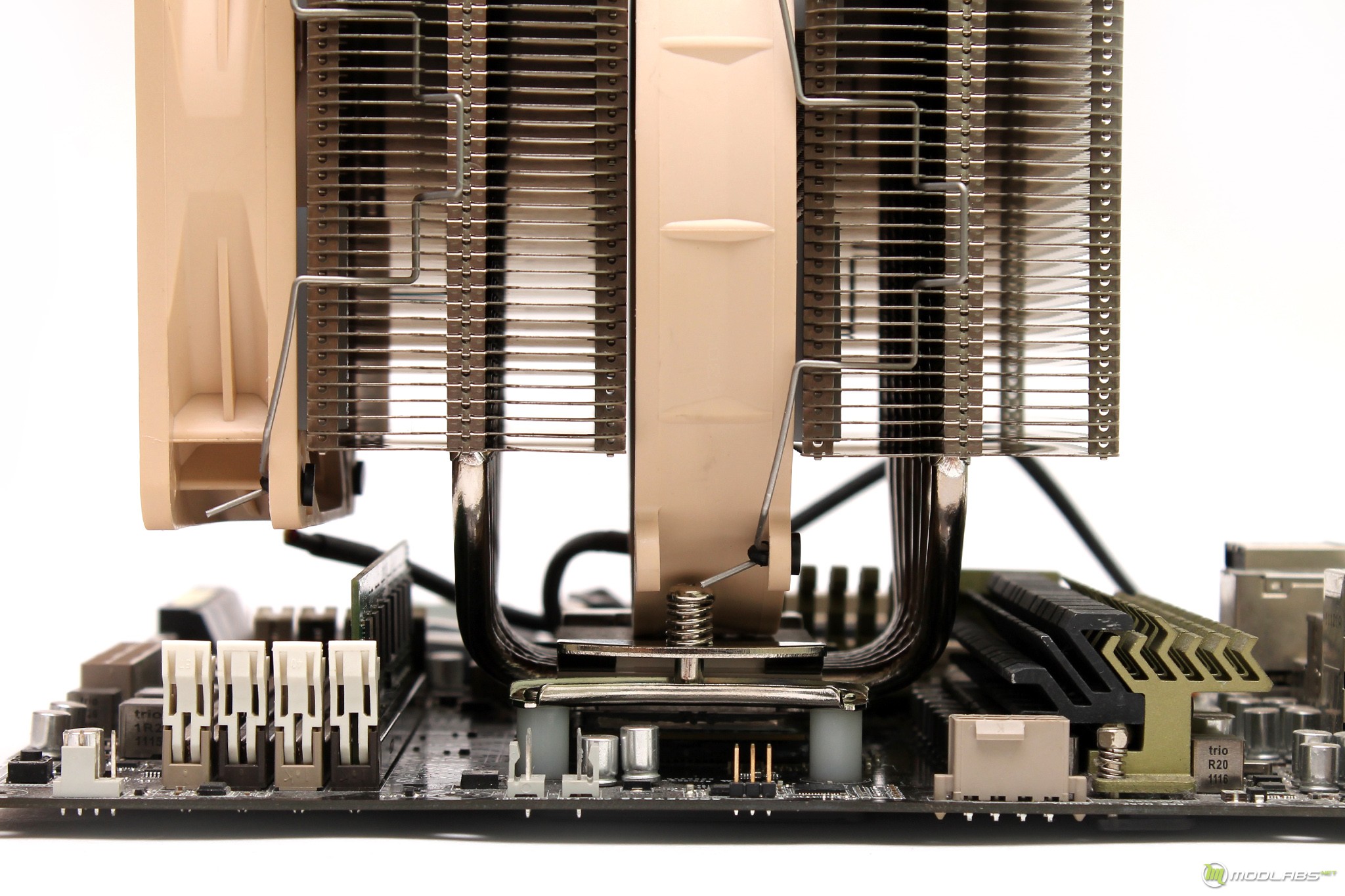 После установки наружного вентилятора, возникли проблемы совместимости с оперативной памятью, все слоты оказались накрыты сверху, что ограничило возможность установки памяти с высокими радиаторами. Тем не менее, установка не 'высокой' памяти происходила без затруднений во все четрые слота. Ребра радиатора находятся на достаточно большом расстоянии от платы, поэтому Noctua NH-D14 не задевает систему охлаждения материнской платы. Полный список совместимых материнских плат вы можете узнать на сайте производителя.