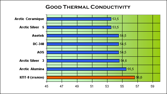 Данная группа - наиболее многочисленная. В нее попал и наш эталон, КПТ-8. Паста в целом показывает удовлетворительные характеристики, однако следует отметить, что в своем ценовом диапазоне она практически не имеет явных конкурентов.