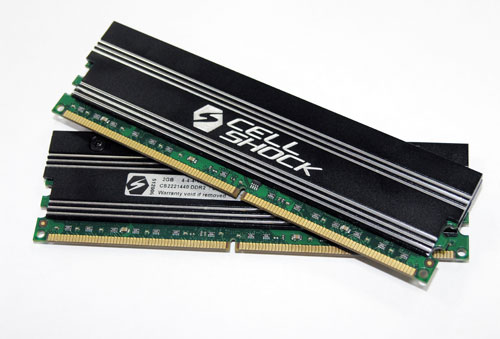 У CellShock таких "прибамбасов" нет, зато радиатор всё же лучше Corsair'овского. Он выполнен из толстых алюминиевых пластин путем фрезерования (а не штамповки, как типичные heat spreader'ы) с черным покрытием и с выгравированным логотипом CelShock по сентру одной из сторон. Безусловно, за счет значительной толщины металла и площади поверхности, а также удачной схемы крепления, такие радиаторы гораздо более эффективно отводят тепло, чем стандартные. Это теоретически позволяет улучшить разгонный потенциал, так как модули будут меньше греться и, соответственно, без проблем выдержат более высокое рабочее напряжение.