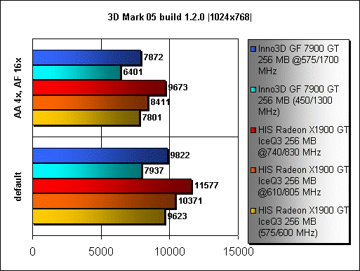Данный синтетический бенчмарк «покровительствует» графическим адаптерам на на чипах от ATI Technologies. Как следствие – не вызывающий удивления результат, который продемонстрировал продукт от HIS. Radeon X1900 GT IceQ3 256 MB, не смотря на дефолтные частоты, демонстрирует примерную производительность, которую видеокарта производства Innovision выдает, выбиваясь изо всех сил. Разгон Radeon X1900 GT IceQ3 не оставляет сопернику никаких шансов в данном тесте.