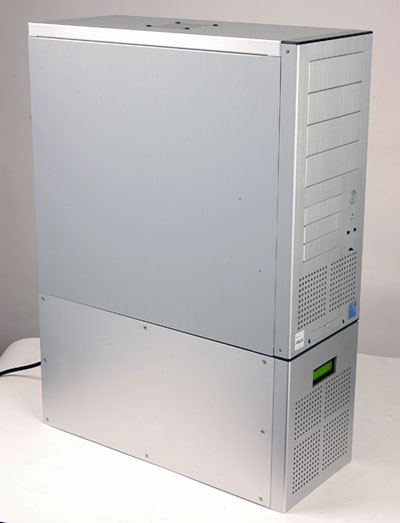 В собранном виде система производит потрясающее впечатление благодаря стильному алюминиевому корпусу. Стандартная комплектация Mach II/Mach II GT предполагает черный миддл-тауэр от Enlight весьма устаревшего дизайна, компоновки и функциональности (с такими корпусами системы серии Prometeia поставляются с самого начала производства в 2001 году) и соответствующий ему по стилю корпус самого агрегата. Однако начиная с 2003 года, опционально предлагается альтернативный премиум-вариант внешнего оформления: в комплекте с Mach 2 поставляется отменный алюминиевый корпус Lian Li PC-60, а сама установка несет на себе соответствующий по дизайну алюминиевый "обвес", чьим производством также занимаются сами Lian Li. Именно в такой комплектации и прибыла наша Prometeia.