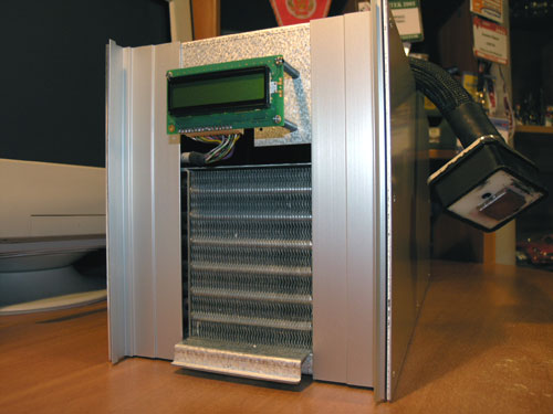 К плате подводится питание от обыкновенного Molex-коннектора: несмотря на то, что компрессор потребляет электричество прямо из сети 220В, вся электроника использует питание от компьютерного БП. Суммарное энергопотребление невелико - мощность тратится только на два вентилятора, LCD-экран и собственно обеспечение работы "мозгов" системы.