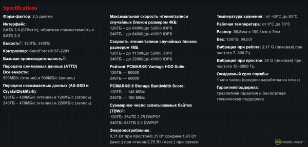 Данная спецификация взята с сайта производителя, в ней представлено подробное описание о возможностях и скоростных характеристиках накопителя, осталось проверить что мы получим на практике.