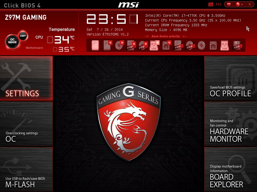 Сборка системы прошла без запинок и каких-либо нюансов. Мы зашли в UEFI меню, на его первоначальной странице пользователь сразу может увидеть краткое описание системы, системную дату, очередность устройств для загрузки, статус функций OC GENE и XMP, а также перейти в следующие пункты меню, ссылки на них располагаются по краям. Всего есть шесть пунктов, предлагаю коротко пройтись по ним.
