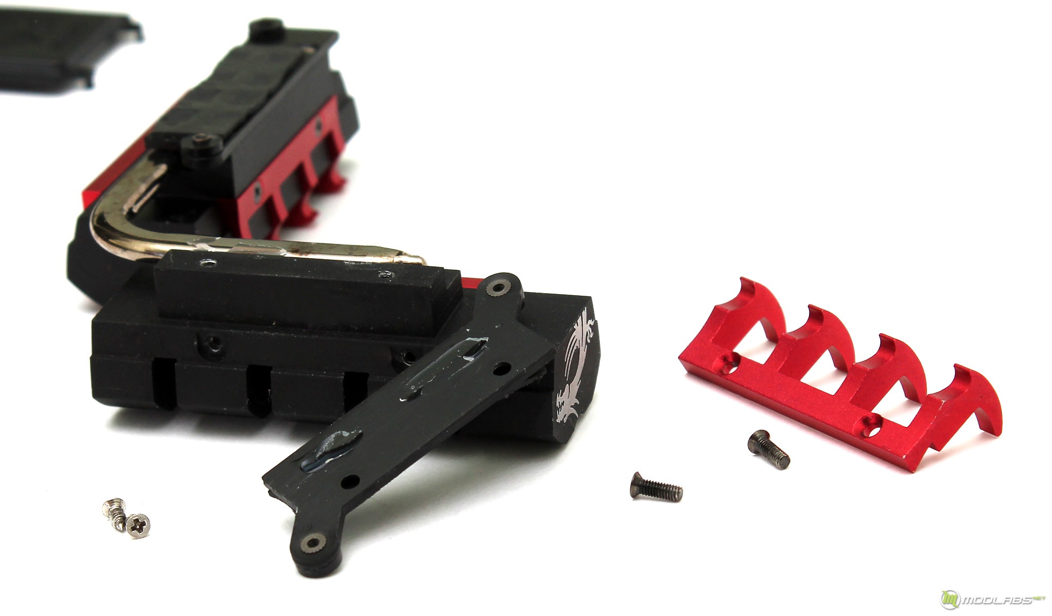 Радиатор системы питания в своей конструкции имеет шесть небольших болтов, ради эксперимента мы решили их раскрутить. И если первые четыре крепят красные вставки, то два оставшихся фиксируют планку основания. Открутив их мы обнаружили, что в месте контакта основания и тепловой трубки отсутствует пайка и на ее месте находится лишь пара небольших капель клея, надеемся теплового. Пользователям, которые не боятся лишится гарантии мы рекомендуем промазать данные места термопастой. Как будет работать радиатор в заводском режиме покажет тестирование.