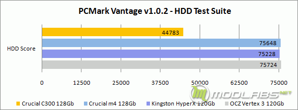 В PCMark Vantage общий балл у Kingston HyperX, OCZ Vertex 3 и Crucial m4 находится на одном уровне.