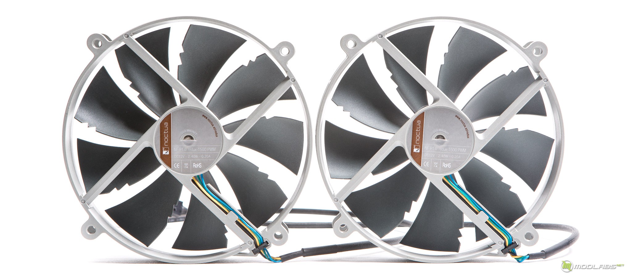 Перед нами пара элитных стосороковок Noctua NF-A15 PWM. Особенностью данной модели является рамка и в частности её размер 140x150x25мм, именно из-за ширины в 150мм её название NF-A15. Некоторых это может ввести в заблуждение, покупатель будет думать, что это 150мм крыльчатка подобно как у TY-150. Но нет, внутри рамки находится 140мм крыльчатка идентичная модели NF-A14. Вращает крыльчатку подшипник SSO2, скорость работы вентилятора от 300-1200 об\мин. Коричневая крыльчатка несет на себе семь широких лопастей с тремя насечками на концах, лопасти находятся под довольно острым углом примерно 40 градусов, длина одной лопасти равна 45,5мм, диаметр самой крыльчатки равен 133мм.