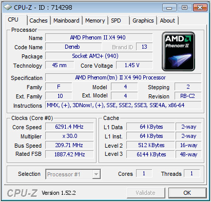Перейдём ближе к практическим вопросам. Тестовая утилита CPU-Z позволяет подробнее ознакомиться с техническими данными AMD Phenom II X4 940:
