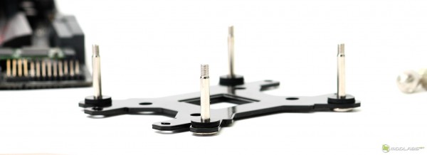 Для примера и дальнейшего тестирования мы проведем сборку на базе платформы LGA1151, в частности для установки используем плату ASUS Maximus VIII Ranger. Весь процесс начинается с подготовки бекплейта: устанавливаем направляющие болты и фиксируем их резиновыми шайбами. Ничего скручивать не нужно – такой подход мне знаком и нравится.