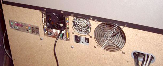 Задняя панель сделана из листа ДВП, в которой с помощью мега-дрели, напильника и наждачной бумаги были пропилены необходимые технологические отверстия. По возможности кабельные выводы были обрамлены кусками от выше упомянутых ручек, а отверстия для вентиляторов зарыты грилями. Стандартная заглушка от материнской платы тоже нашла себе место. В свободное пространство на месте карт расширения вставлен вентилятор размером 80х80 мм. Он создает дополнительный воздухоптоок для охлаждения видеокарты.