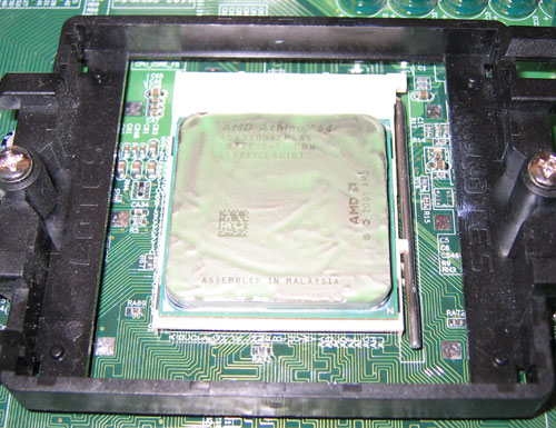 Ничего особенного, да? Конечно, если не брать во внимание того, что снимок сделан уже после тестирования зеленого вещества. Если просто – то кулер уже с ним просто намертво приклеился к крышке процессора. Извлечь последний из сокета в сранвнении с последующими мучениями особого труда не составило, заняв около двух минут. Потом – час времени, потраченный на отдирание/отрывание кулера от процессора. Вам смешно? А я за этот период, используя страшные приспособления и различные вандалистские действия (какие – не скажу – пусть собственник процессора спит спокойно:)), вспомнил много хороших слов, и в придачу слегка повредил теплораспределительную крышку. К счастью, в конце концов, проблема была решена при помощи широкого острого канцелярского ножа и молотка, кулер успешно отодран, крышка выровняна (ибо до этого я ее успел слегка погнуть). После таких зверств автор, решив, что терять ему нечего, уже морально приготовился к ещё часу работы с розовым компонентом и их смесью. Правда, впоследствии протестировал их всего по одному разу.