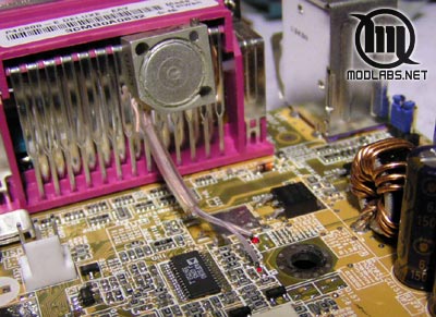 Искомый элемент платы (микросхема с маркировкой ADP3180) находится недалеко от процессорного сокета, в сторону I/O-портов. Изначально мод был весьма непростым, так как требовал подпайки к двум почти соседним (да к тому же тонким) ножкам одной микросхемы. Но есть более удобный способ, с припаиванием просто к контактам на плате. Его я и опишу.