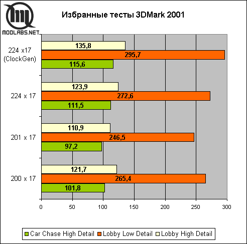 Для P4P800 этот трюк тоже работает, однако у этого метода есть недостатки. Во-первых, чтобы получить этот прирост, нужно поднимать частоту именно с 200MHz, то есть грузиться в неразогнанном режиме и повышать только с помощью ClockGen. Во-вторых, уровень стабильности для самого чипсета снижается где-то до 220-225Mhz. А в-третьих, как ни странно, но не все программы адекватно реагируют на подобный разгон. В то время, как оба теста 3Mark (и любые другие real-life приложения) начинают просто-таки летать, Sandra и PCMark ведут себя, словно ничего не изменилось...