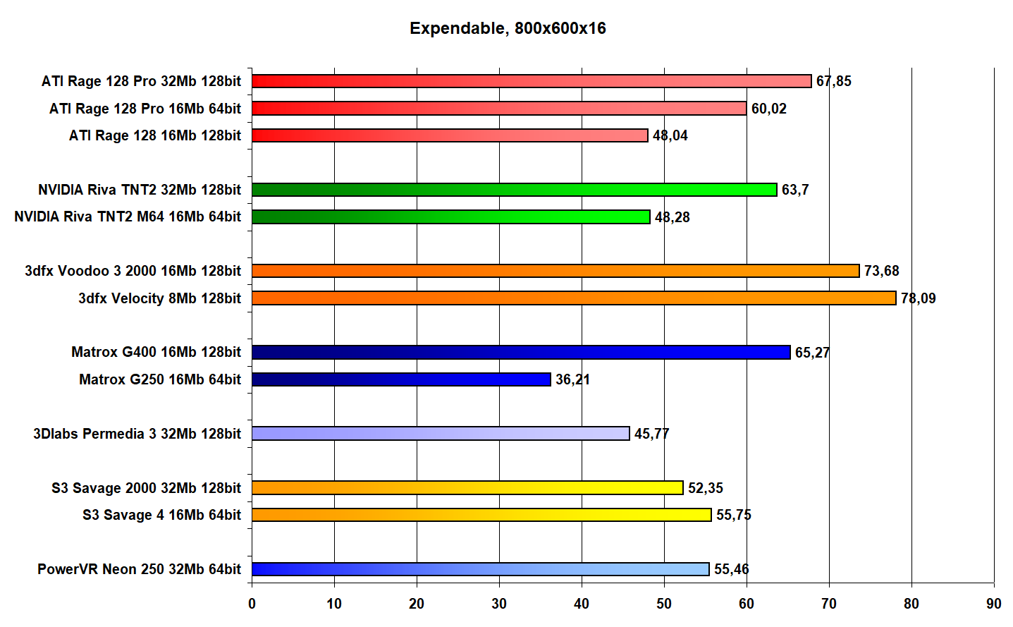 В качестве конкурентов я взял популярные в 1999 году видеокарты, но не самого верхнего сегмента, ибо Neon 250 позиционировался, как достаточно дешевая карта.