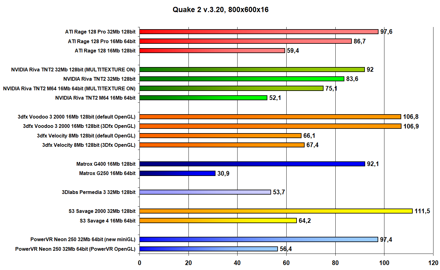 Результаты карт NVIDIA с пометкой (MULTITEXTURE ON) - драйвер NVIDIA принудительно отключает мультитекстурирование на картах TNT и TNT2 в 16 битах в Quake 2 и в играх на его движке, дабы стимулировать переход на 32 бита и покупку новых карт. Включение переменной GL_SGIS_MULTITEXTURE позволяет узнать, как могли бы работать карты TNT и TNT2 в играх на движке Quake 2, если бы NVIDIA не строила козни против пользователей своих же видеокарт.