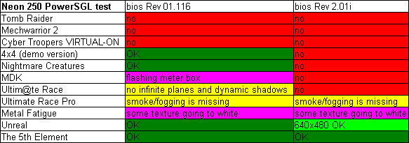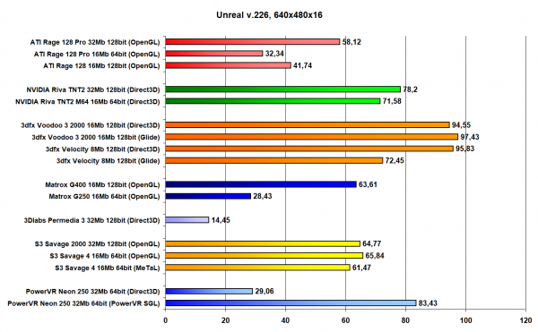 В Unreal Неон тестировался на версии 221, в более поздних версиях поддержка Power SGL выпилена. Так же, все видеокарты запускались в том API, в котором они показывали наилучшие результаты без ущерба качеству картинки. Бонусом некоторые карты прогонялись в нативных API (Glide, MeTaL).