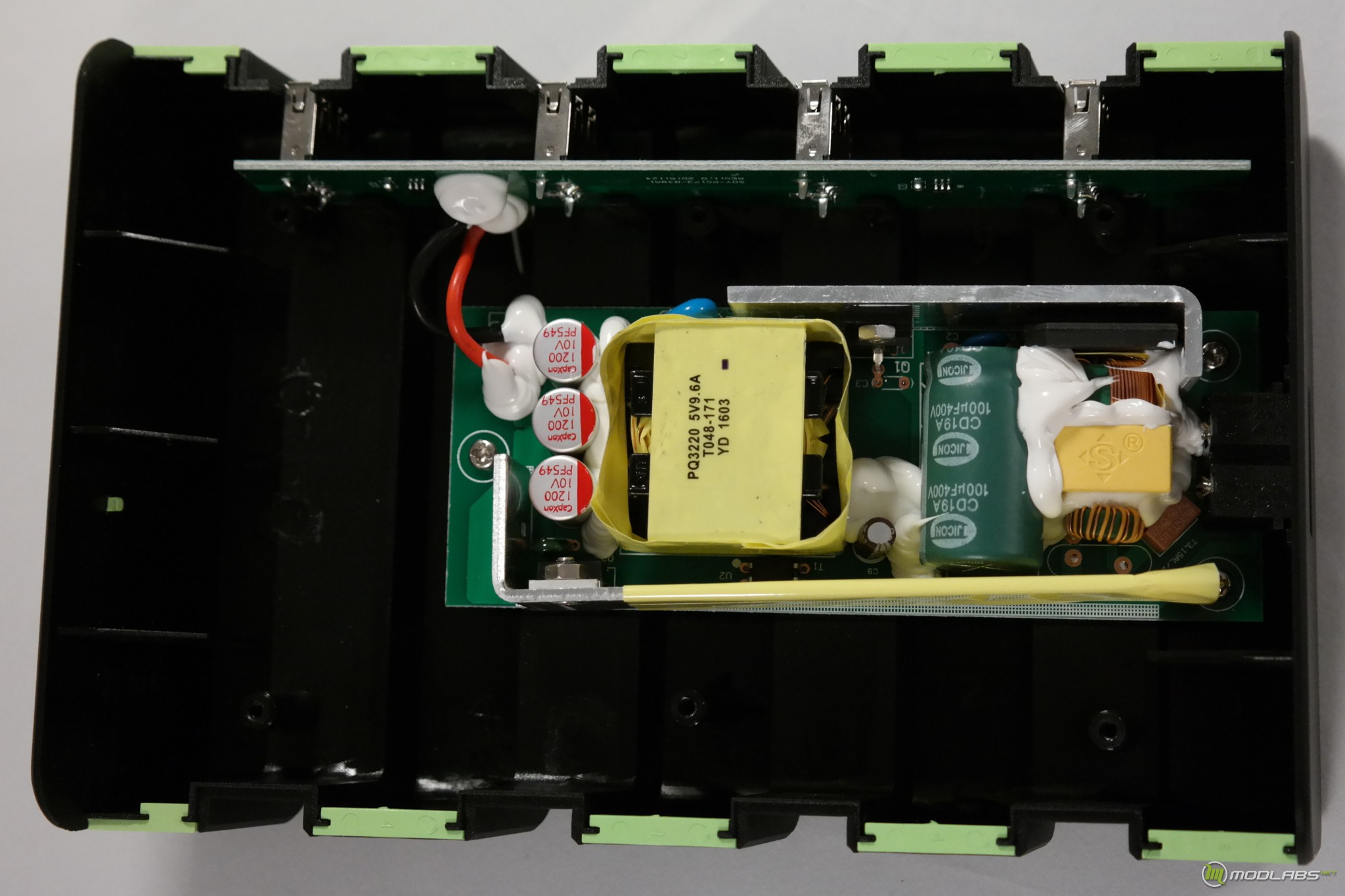 Внутри - качественная печатная плата из стеклотекстолита и не менее качественно смонтированные радиоэлементы. Очевидно, что на качестве не экономили. Внутри корпуса много свободного места, устройство могло бы быть значительно меньшего размера. Но тогда бы пришлось отказаться от слотов для крепления смартфонов и планшетов.