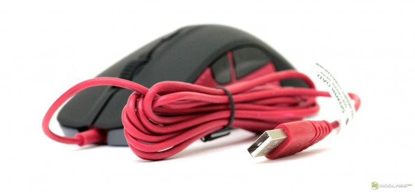 Подключение мышки происходит при помощи одного USB-кабеля, он выполнен в красной и довольно плотной резиновой оплетке. Многие такой вид оплетки считают более прочным, нежели обычный тканевый.