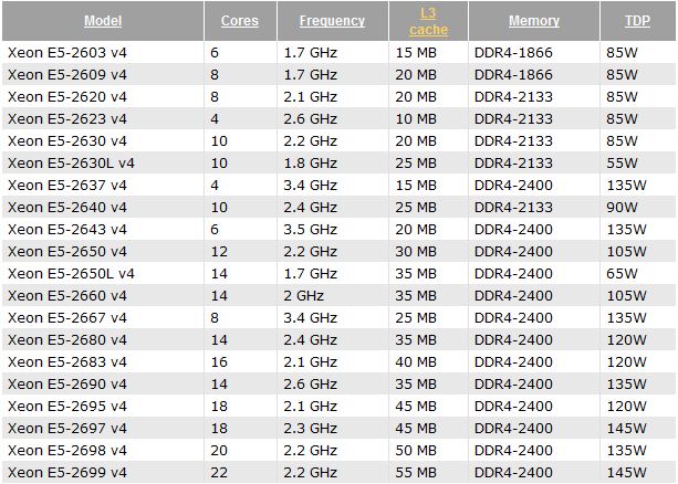 Полный список основных характеристик процессоров Xeon E5-2600 v4 (Broadwell-EP):