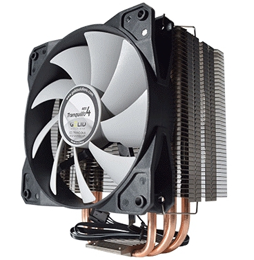 С помощью двух комплектных скоб сбоку конструкции GELID Rev. 4 Tranquillo располагается 120-мм вентилятор, который оснащен модулятором PWM. Пропеллер предлагает переменную частоту оборотов от 750 до 1600 единиц в минуту. Фан на базе гидродинамического подшипника имеет среднее время наработки на отказ до 50 тысяч часов, а создаваемое ним звуковое давление находится в интервале 12 – 26,7 дБА.