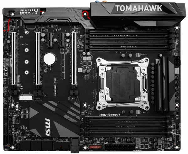 Стоит сказать и о наличии на плате MSI X99A TOMAHAWK коннектора 4-pin, который позволит включать в систему стандартные светодиодные ленты 5050 RGB LED. Управление подсветкой производится посредством программного обеспечения MSI.