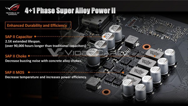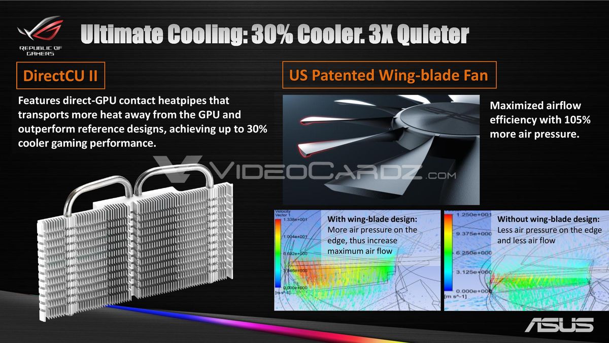 Новинка задействует в основе полноразмерную печатную плату, которую полностью прикрывает STRIX-версия системы охлаждения DirectCU II на два слота расширения материнки. Здесь задействованы запатентованные вентиляторы Wing-Blade, а также алюминиевый радиатор с парой тепловых трубок. Кожух украшает подсветка Aura RGB. Сообщается о применении в адаптере технологий Auto-Extreme с Super Alloy Power II, а также 4+1-фазной подсистемы питания.