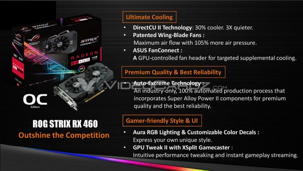 Компания AMD осуществила анонс графического ускорителя Radeon RX 460 в конце прошлого месяца, а теперь у нас есть возможность познакомиться с предложениями партнеров производителя. ASUStek, к примеру, опубликовала полный перечень характеристик фирменной модификации серии Republic of Gamers, которая получила название ASUS RX 460 STRIX (STRIX-RX460-O4G-GAMING).