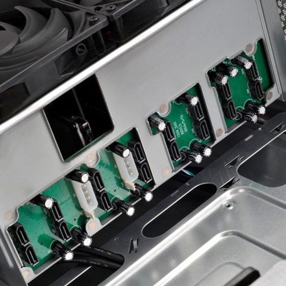 Шасси SilverStone CS380 практически полностью выполнено из стали, конструкция предусматривает возможность инсталляции плат расширения PCI длиной до 240 мм, а также процессорных охладителей высотой максимум 146 мм. В комплект поставки входит два 120-мм вентилятора, которые обдувают корзину с накопителями, еще одна «стодвадцатка» работает на выдув с тыльной стороны. Организация охлаждения дисковой подсистемы здесь выполнена на хорошем уровне, лучше только в серверах. Кстати, временная аренда сервера в датацентре Дельтахост (сроком примерно на 2 месяца) вполне может обойтись дешевле, чем один такой корпус, а если посчитать стоимость дисков и всего остального железа....Впрочем, не об этом речь.