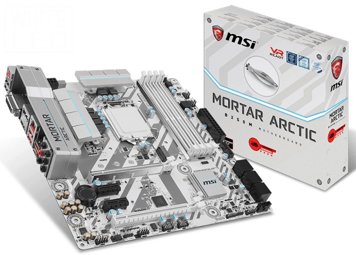 MSI B250 Mortar Arctic – это компактное решение формата MicroATX, основанное на чипсете Intel B250. Здесь реализована возможность установки четырех планок памяти DDR4-2400 МГц максимальным объемом до 64 Гбайт, присутствует также шесть портов SATA-III и один Turbo M.2. Для видеокарт и карт расширения реализовано по паре разъемов PCI-Express 3.0 x16 и PCI-Express 3.0 x1.