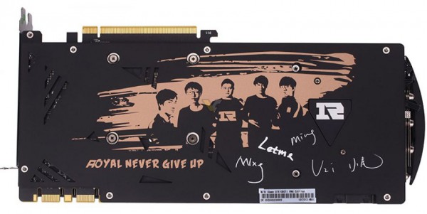 Сообщается о наличии в GTX 1080 Ti 11GB iGame RNG Edition 16+2-фазной подсистемы питания COLORFUL IPP (iGame Pure Power), местная трехслотовая система охлаждения SWORIZER состоит из двойного алюминиевого радиатора, медных теплотрубок, теплорассеивающих пластин и трех вентиляторов. В наличии оригинальный золотистый кожух с черными боковинами. Есть данные о наличии подсветки RGB LED. Тыльная сторона прикрыта пластиной с изображением и подписями участников команды RNG eSports.