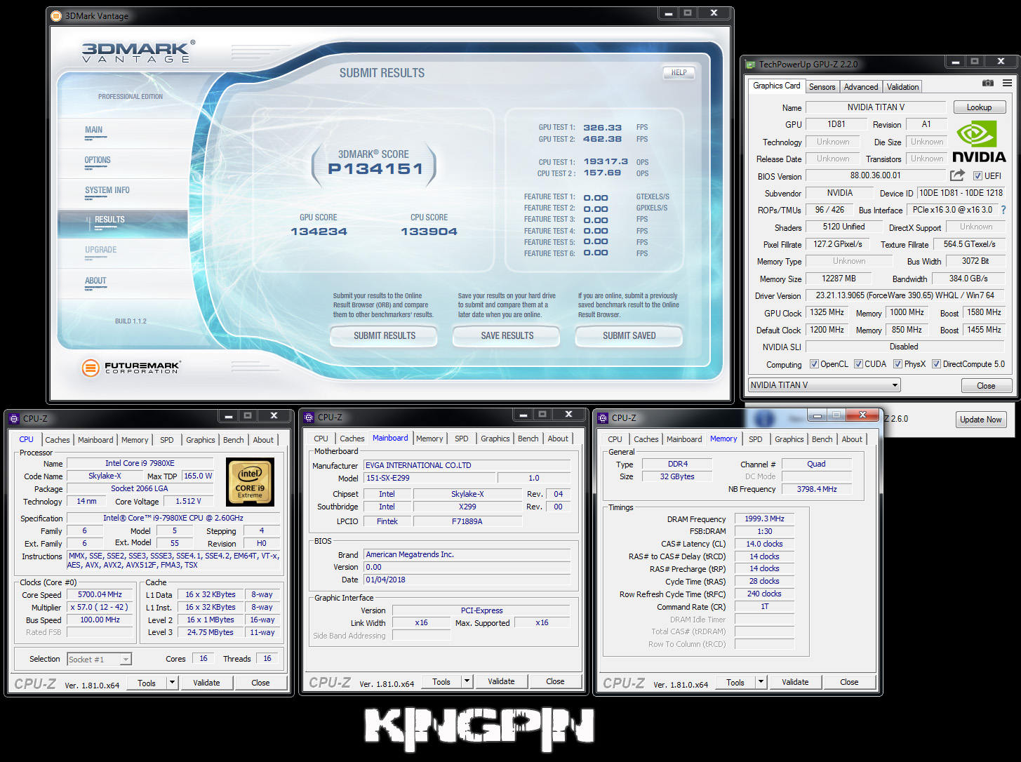 Для дисциплины 3DMark Vantage-Performance уровень форсирования CPU и памяти был такой же, что до видеокарты GTX Titan V, то в этом случае частотная формула имела вид 2150/999 МГц. Итоговый рекордный результат в данной категории составил 134151 балл.