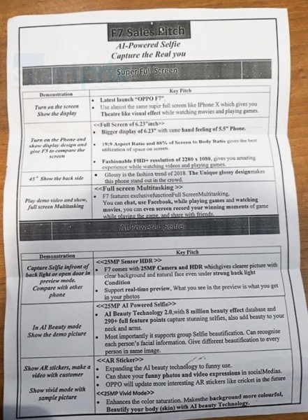 До официального анонса высокоуровневого смартфона Oppo F7 остаётся всего несколько дней, однако последние утечки раскрыли практически все характеристики будущего продукта. И теперь заполнить имеющиеся пробелы в спецификациях новинки поможет попавшая в Сеть памятка для продавцов данного аппарата.