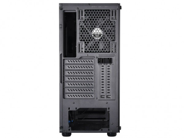 Фронтальная панель имеет темную шлифованную поверхность с крупными вентиляционными отверстиями на торцах. Здесь же на правом боку присутствует I/O-панель с парой портов USB 3.0 и двумя аудиоразъемами. Спереди реализован один 5,25-дюймовый отсек. Боковая дверка шасси выполнена полностью из закаленного стекла.