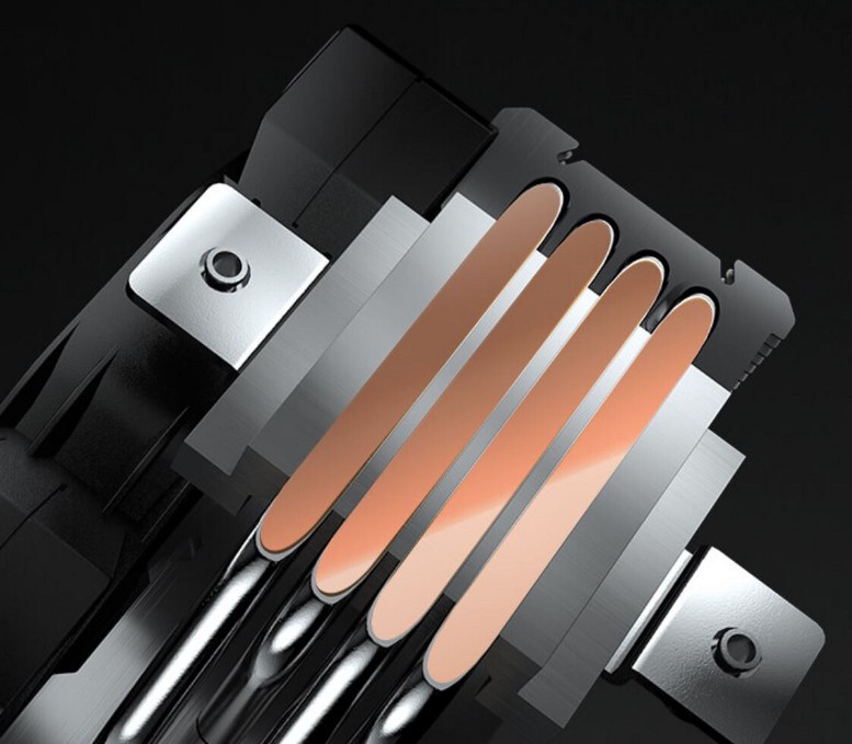 Теплосъемник по всей высоте пронизан четырьмя 6-мм медными никелированными тепловыми трубками, концы которых сверху имеют колпачки. Для увеличения эффективности охлаждения трубки впрессованы в основание и имеют непосредственный контакт с крышкой процессора.