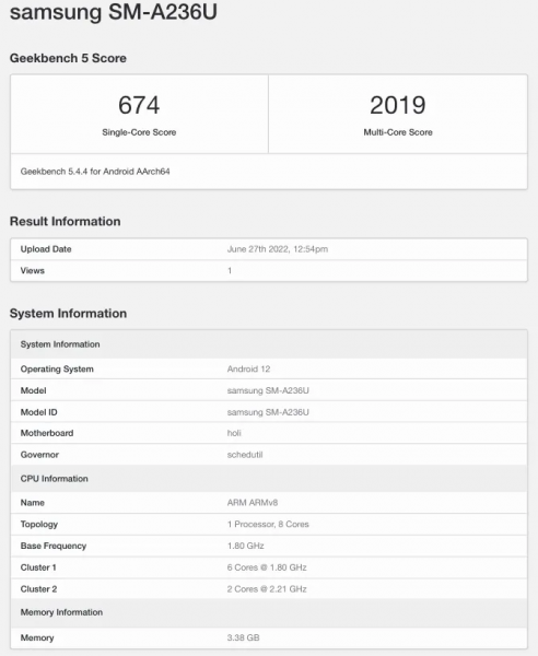 В марте этого года свет увидел Samsung Galaxy A23 на базе процессора Snapdragon 680, предлагающего поддержку 4G. А пару месяцев спустя появились намеки на запуск 5G-модели. И теперь смартфон был замечен в базе данных Geekbench. Аппарат имеет код SM-A236U. Судя по всему речь идет об американской версии. Ожидается среди прочего появление и европейской версии.
