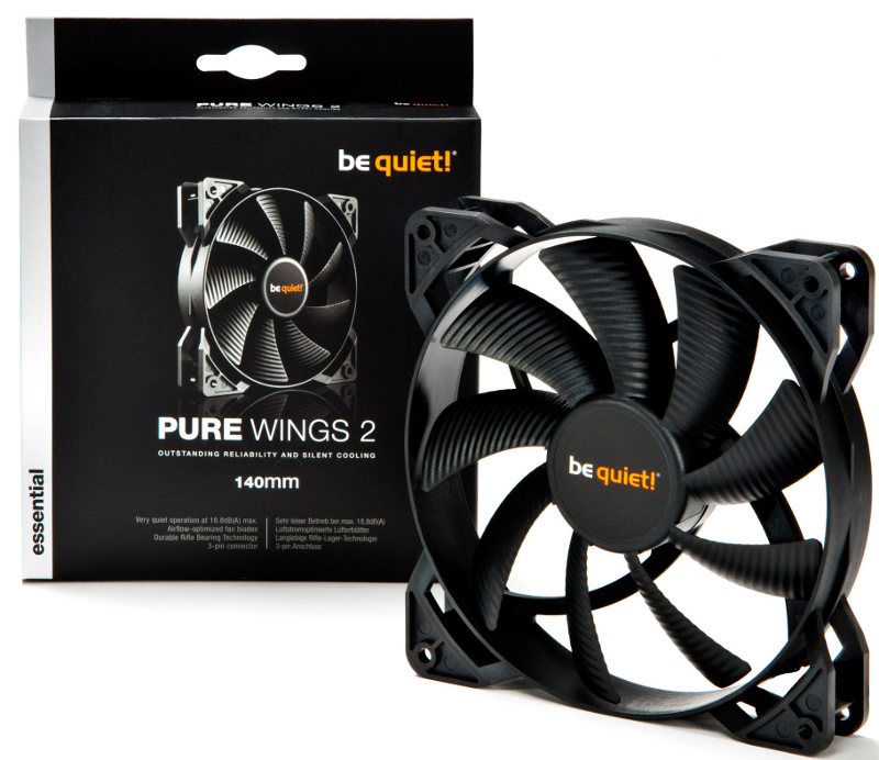 Более крупный представитель данного пополнения характеризуется линейными размерами 140 х 140 х 25 мм и работает с максимальной скоростью до 1000 об/мин, в этот момент звуковое давление достигает отметки 18,8 дБА, а воздушный поток равен 61,2 кубических футов в минуту. Что касается 120-миллиметрового представителя линейки Be quiet! Pure Wings 2, то его габариты составляют 120 х 120 х 25 мм, при максимальной рабочей скорости 1500 об/мин, звуковом давлении 19,2 дБА и предельном воздушном потоке 51,5 CFM.