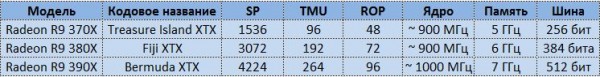 Сообщаются в утечке и частотные характеристики будущих новинок, а также их шина. Например, Radeon R9 390X получит 512-битный интерфейс и может работать на частотной формуле 1000/7000 МГц, адаптер R9 380X при рабочей скорости 900/6000 МГц должен располагать шиной 384 бита, ну, а R9 370X, согласно полученным данным, порадует частотой работы ядра и памяти на уровне 900 МГц и 5000 МГц соответственно, при 256-битном интерфейсе.