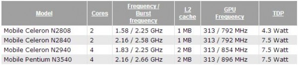 Новые четырехъядерные модели N2940 и N3540 являются усовершенствованными версиями N2930 и N3530, работают они на частоте 1,83 ГГц и 2,66 ГГц, их встроенная графика также характеризуется номинальной скоростью в 313 МГц.
