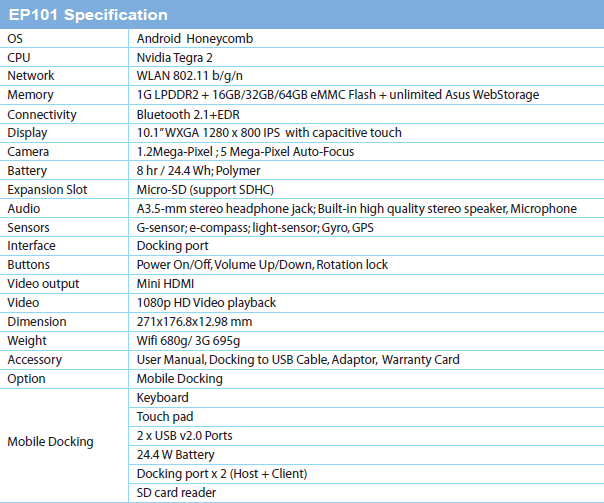 ASUS Eee Pad Transformer включает в себя двухъядерный процессор ARM Cortex-A9, 1 ГБ оперативной памяти LP-DDR2, 16/32/64 ГБ памяти на носителе eMMC, 1,2-мегапиксельную фронтальную и 5-мегапиксельную тыльную камеру с автофокусом, а также графическое ядро с возможностью воспроизведения видео 1080p. Кроме того, аппарат содержит WiFi-адаптер (802.11b/g/n), Bluetooth 2.1 + EDR, G-сенсор, цифровой компас, гироскоп, датчик освещенности и 3G-модем (опционально). На Тайване новинка должна стоить примерно $660.