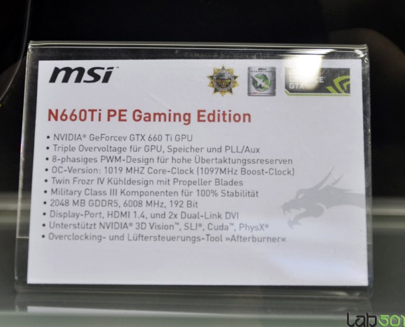 Хорошо знакомая система охлаждения Twin Frozr IV, которая нашла здесь применение, состоит из алюминиевого теплосъемника, никелированных теплотрубок и двух вентиляторов с лопастями Propeller Blade. Кожух кулера оформлен в характерной для MSI G-Series черно-красной цветовой схеме, на вентиляторах присутствует эмблема дракона. Производитель предусмотрел в карте MSI N660Ti PE Gaming Edition набор компонентов Military Class III, на интерфейсной панели разместились видеовыходы Dual-Link DVI в количестве двух штук, а также по одному HDMI 1.4 и DisplayPort. Дата релиза новинки, как собственно и ее стоимость, производителем пока что не уточняется.